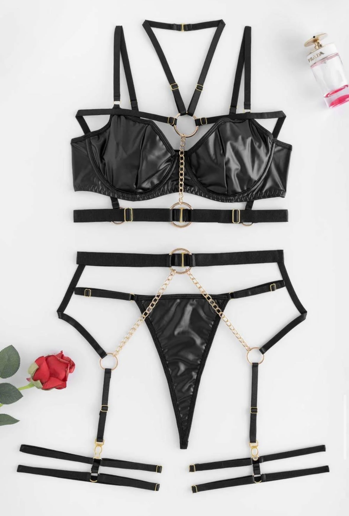 => Magnifique ensemble noir effet latex avec un soutien gorge sans armature, un porte jarretelle, un string ainsi que des tours de cuisses🖤